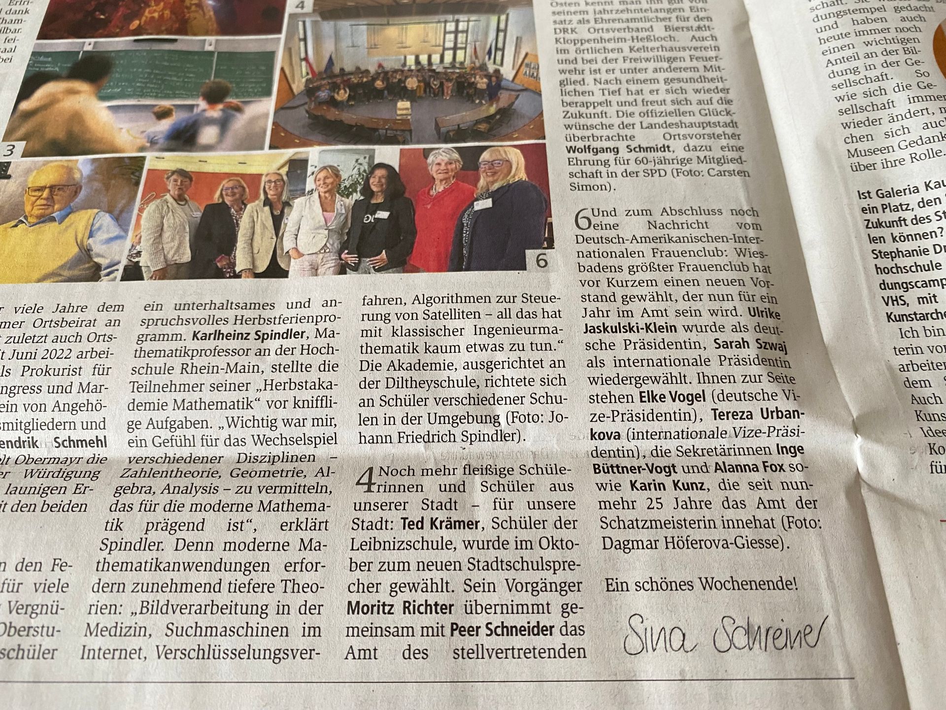 Am 26. April 2024 war der Club erneut ein Thema im Wiesbadener Kurier! Dieses Mal ging es um unsere Wahlen und neuen Vorstandsmitglieder ab 2025.